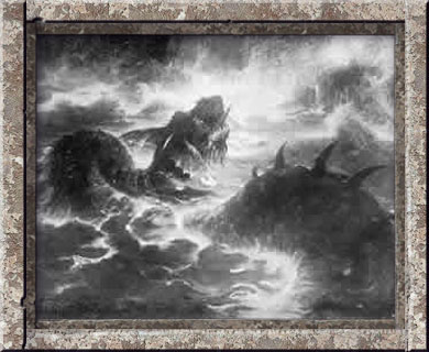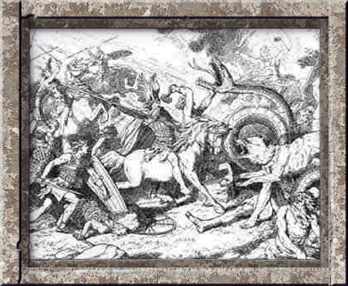 La temible serpiente de Midgar, Iörmungandr, había sido despertada por el alboroto general y con inmensos retorcimientos y conmoción, por lo que los mares fueron azotados con enormes olas como nunca antes habían alterado las profundidades del mar, se arrastró hasta la tierra y se apresuró a unirse a la terrible refriega, en la que iba a jugar un papel importante.