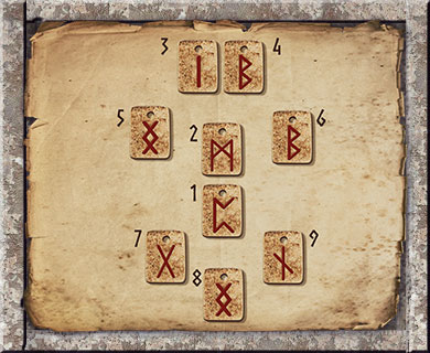 Para realizar esta lectura, se distribuyen las runas según se muestra en el siguiente esquema: